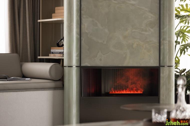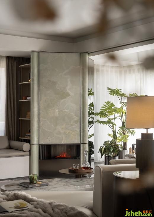 样板房设计的细节之处不在于繁复的堆砌,而是设计师的巧思。艾未设计强调生活与艺术的融合,壁炉与客厅背景墙以青玉石铺就,飘窗与角落书架则是轻松阅读的有效引导,丰盈的绿植也给室内带来了无限生机。