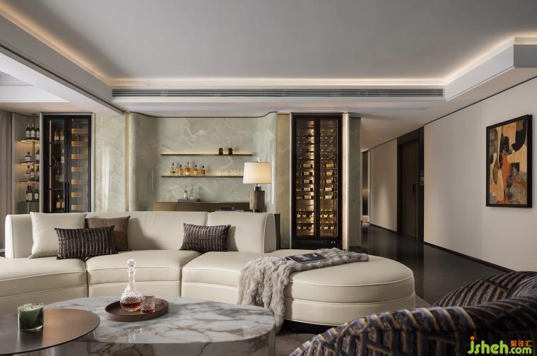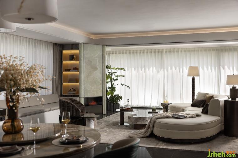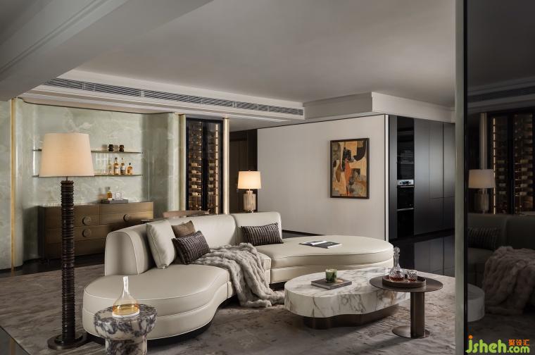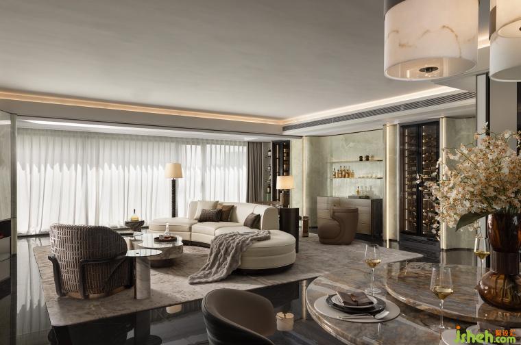 约270°的环幕视野,让阳光肆意倾洒,观景效果极佳。光影勾勒形体,色彩渲染风格,以打造能量社交场。视觉的温暖和青玉石带来的温润质地,在淡雅柔软的饰面映衬下,散发着慵懒惬意之感。
