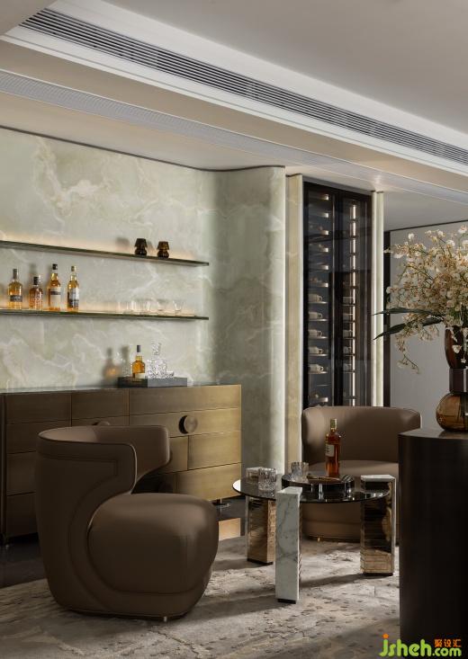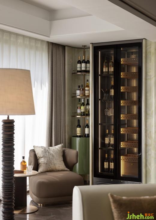 弧形沙发后的一组休闲椅,旨在实现生活方式及场景需求的变换组合。既是茶台,亦可是开放的亲子空间。同时有效利用墙体和飘窗,定制丰富的藏酒区,以美学介入未来生活,透露居者品味之余,让这一隅也拥有着无限延展性。