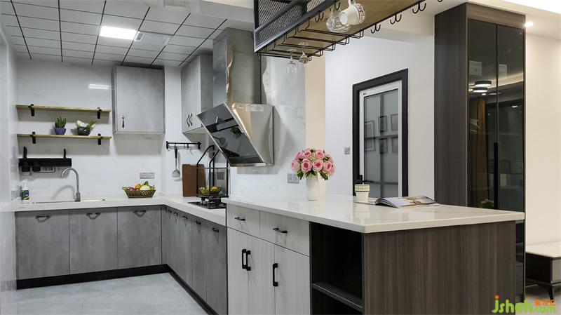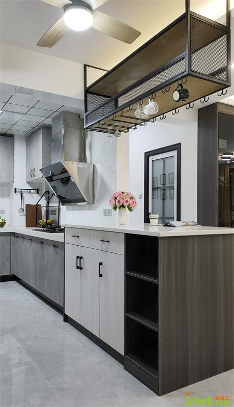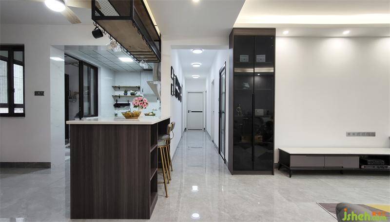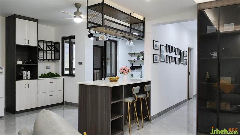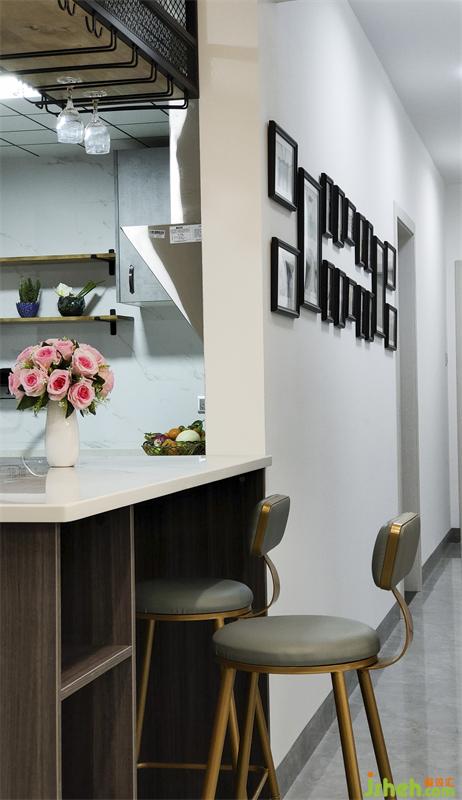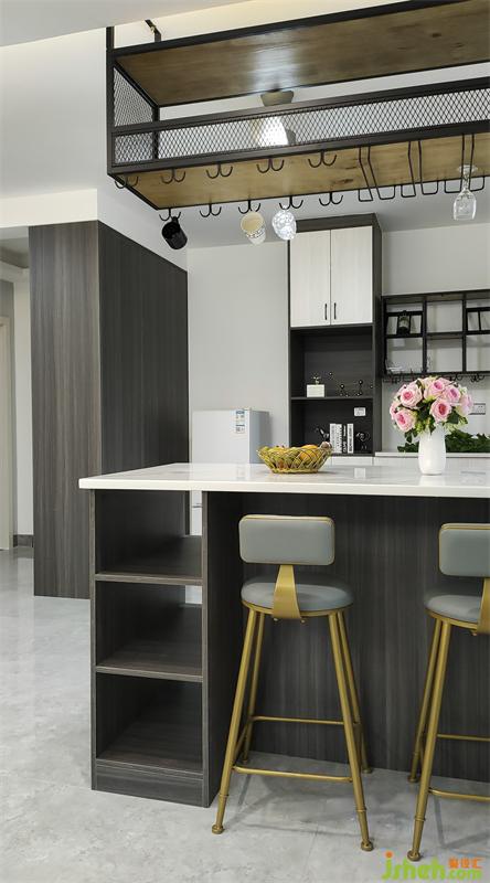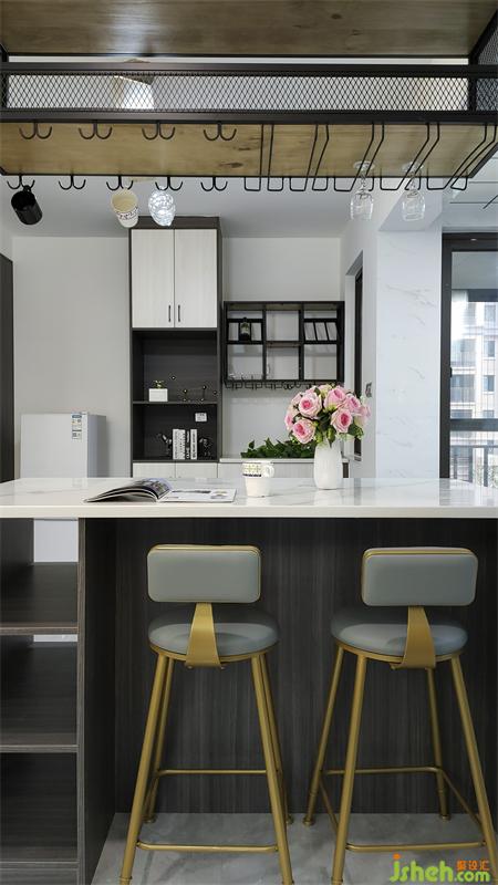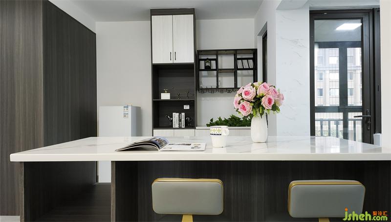 厨房橱柜和餐厅吧台连接,装修设计了开放式厨房以及mini简餐台,这样厨房的操作空间变得丰富,通风和采光变得更好,更重要的是家人无论是准备美食还是冲调咖啡时都可以和其他成员的互动