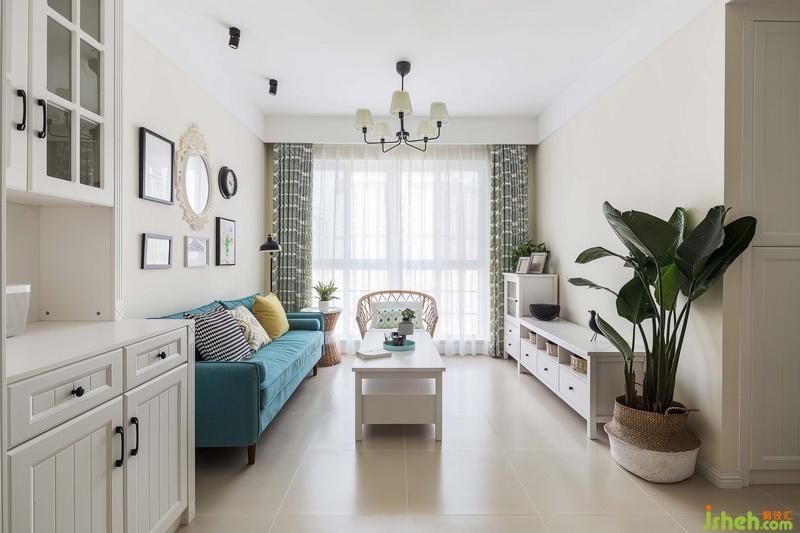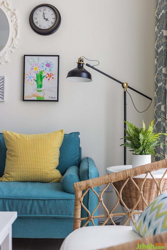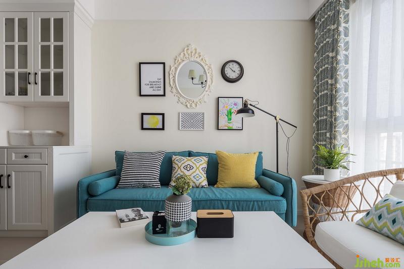 蓝色主沙发点缀跳色靠枕,背景室内设计师采用不同的墙饰与简框画装饰出不对称的美