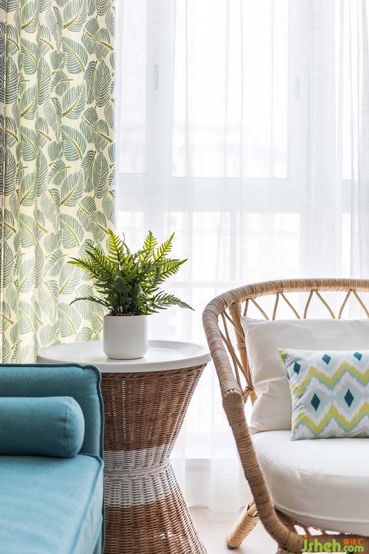 白纱与绿色系叶片图案窗帘,营造明亮舒适的清新氛围