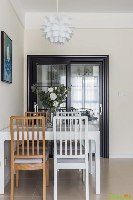 白色与木色餐椅相搭,唯美赋有艺术气息的软装与灯饰点亮餐厅