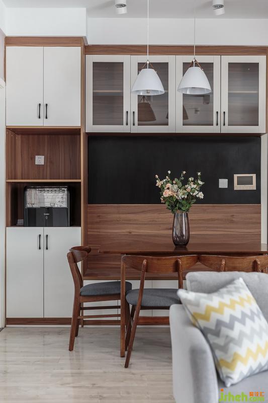 卡座餐厅结合收纳柜体设计,合理利用空间,并增加收纳机能。