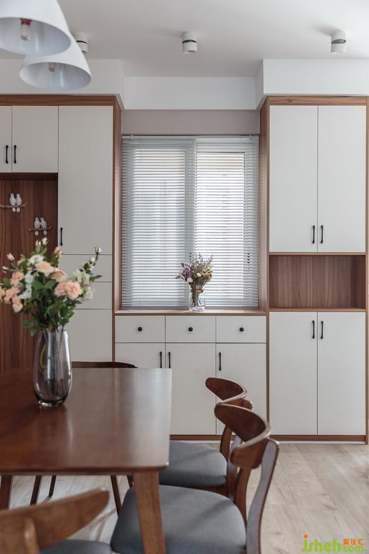 从餐厅望向入户量体,正好留出窗口辅以百叶,大面积柜体即是入户收纳也是餐厅背景。