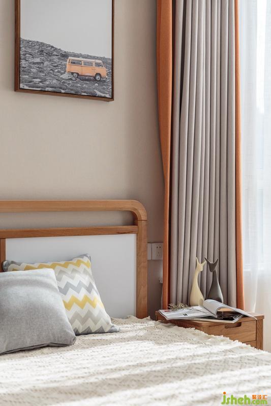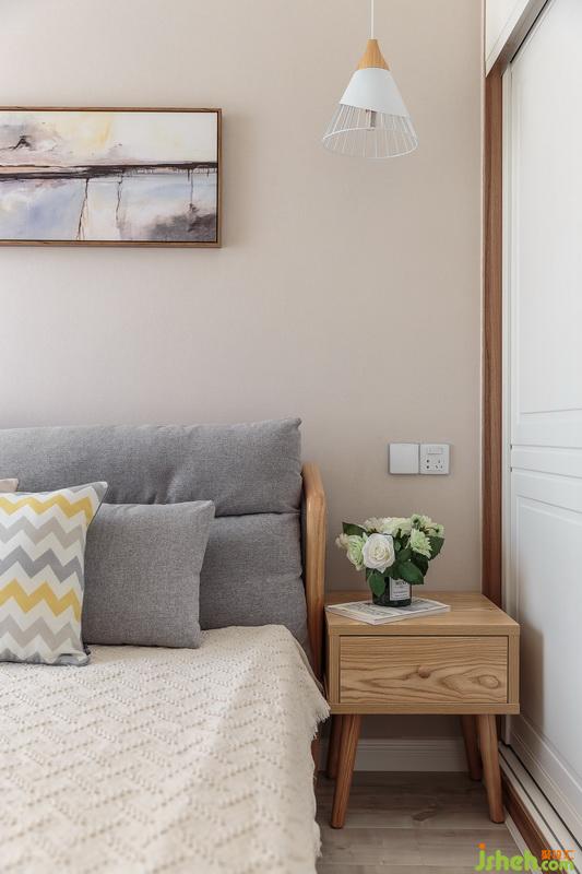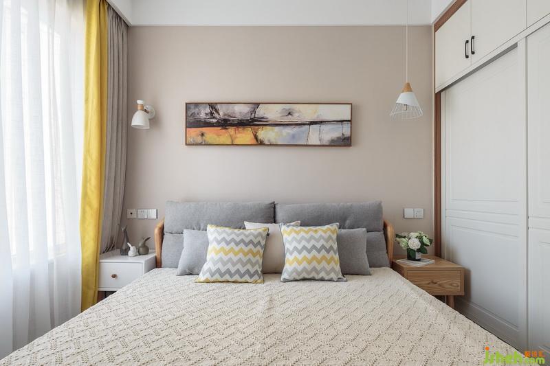 主卧延续浅咖色墙面,挂一幅抽象装饰画,辅以壁灯与悬挂式吊灯作卧室照明。