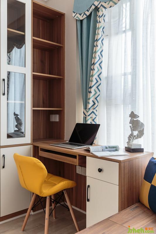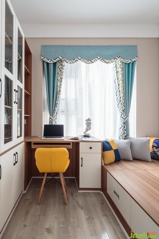 儿童房,设计榻榻米床铺,写字台连接背景书架。