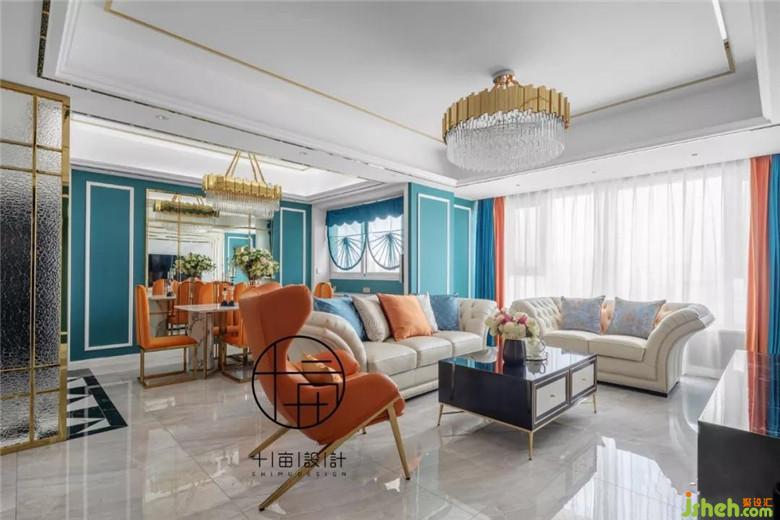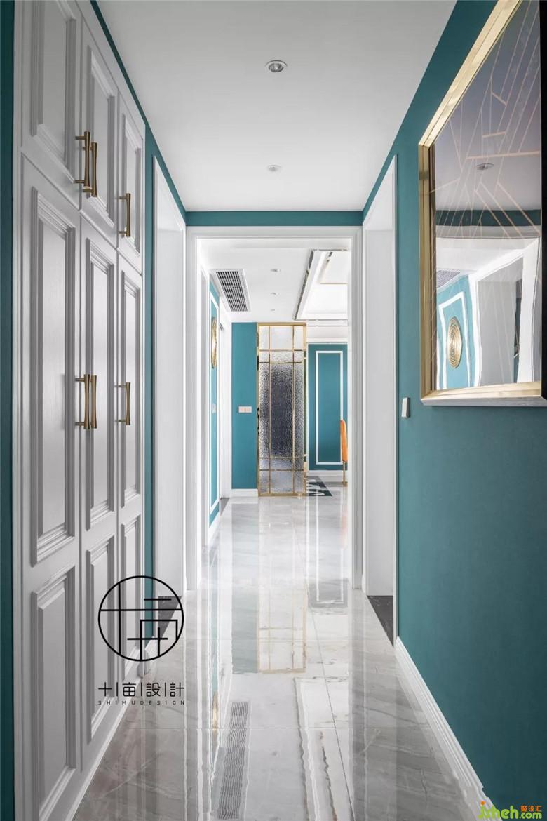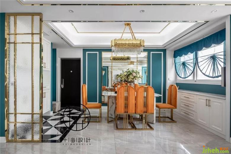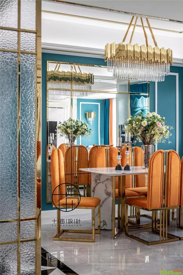 整体的元素定义在Art Deco(装饰艺术),玄关地砖用了几何的元素,餐厅镜子是茶色一是和金属色统一,二是餐厅空间并不大从视觉上让空间更开阔,磨砂玻璃也是和金属相嵌,呼之欲出的浪漫奢华气息。