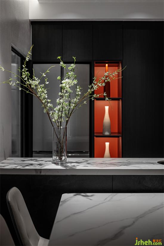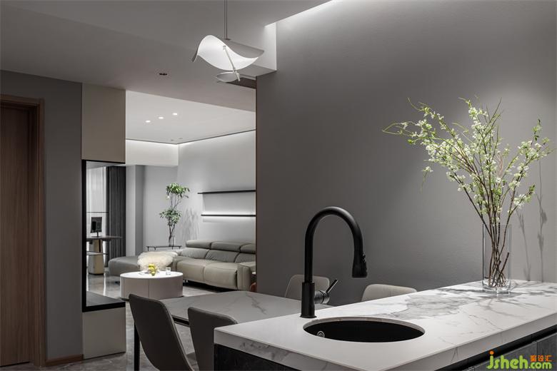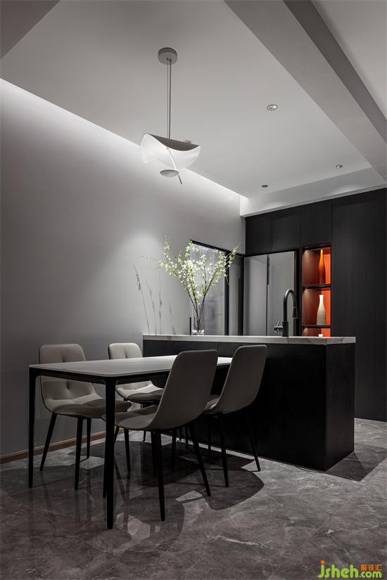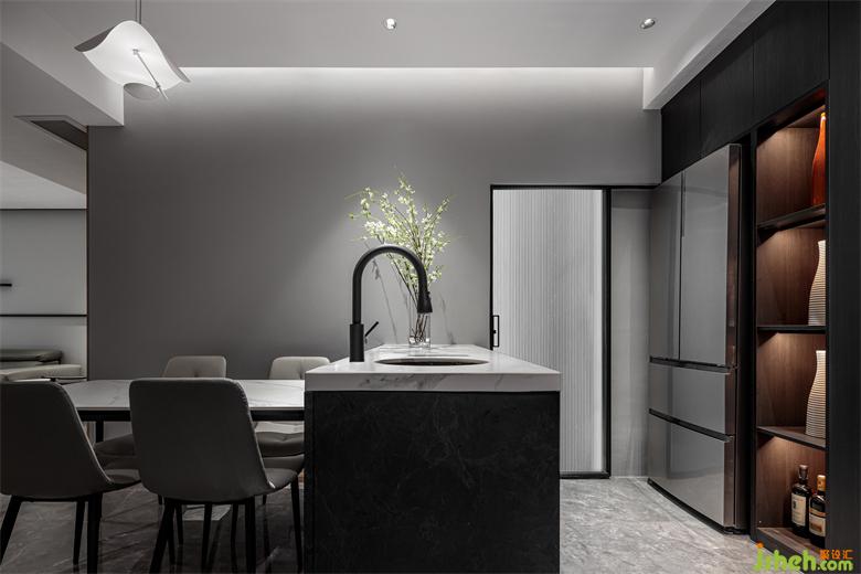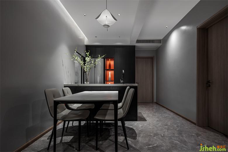 灰色为底,配以黑色和木纹,整个空间呈现出沉稳内敛的风格,家装设计长虹玻璃门与暖色灯光呼应出精致的格调。
