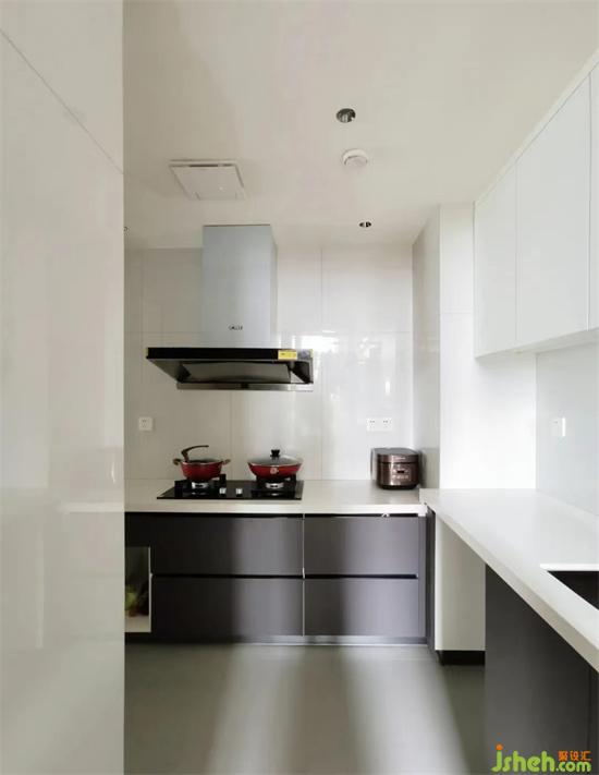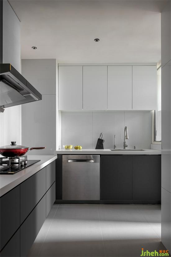 厨房色调搭配上明暗分明,黑白灰配色延续经典。家装设计地柜用黑色,增加厚重感与安全感。吊柜用白色,增加空间明亮度。