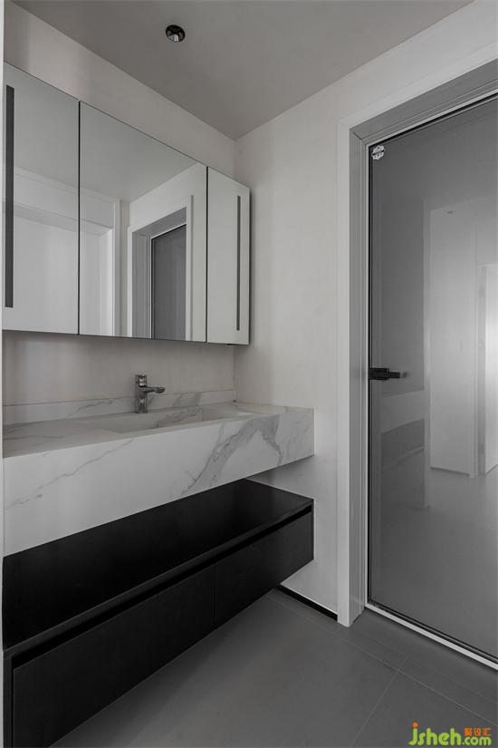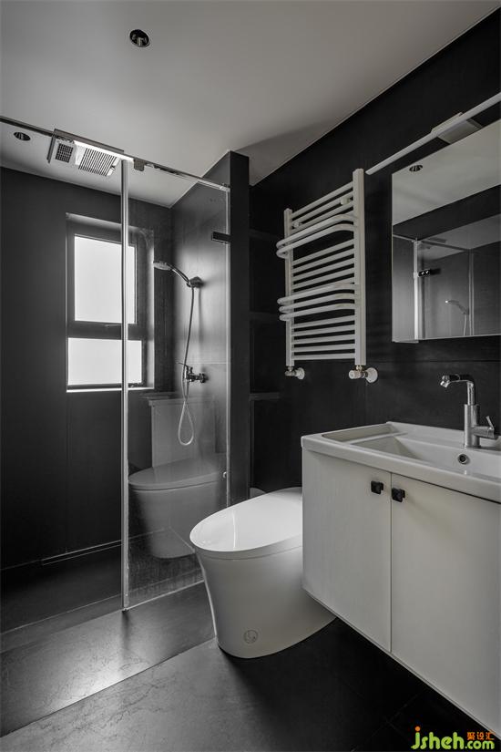 主卫采用干湿分区,空间布局更加合理。家装设计次卫以黑色为主,与全屋而言形成了色彩上的反差。浴室柜与洁具的选择则是白色,鲜明的色彩对比增加了空间层次感。