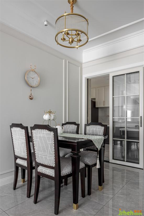 The dining table and bucket cabinet are made of classic and timeless black, elegant in shape, matched with gold handle and foot ornament, full of texture. Metal chandeliers and wall clocks echo each other, and the whole space has a brilliant style.