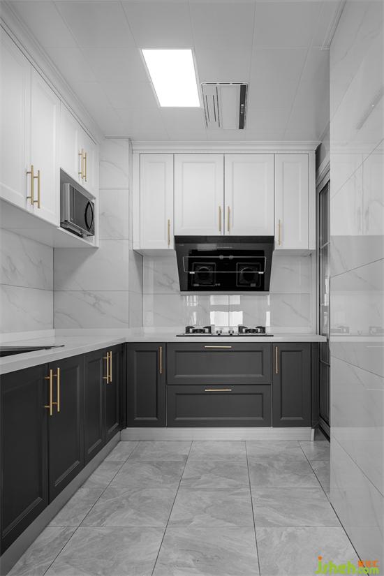 厨房采用了经典的黑白灰色系搭配,拓宽了了视觉纵深。家装设计金色拉手作为点缀,提升了整个空间的质感。