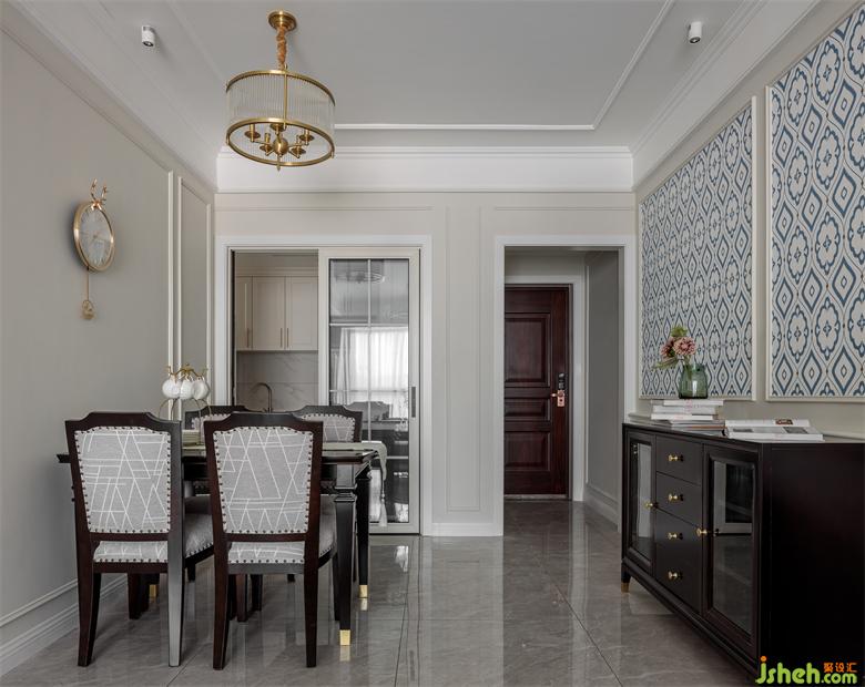 餐桌和斗柜选择了经典不过时的黑色,造型典雅,搭配金色拉手和脚饰,质感拉满。家装设计金属吊灯和挂钟交相呼应,整个空间格调斐然。