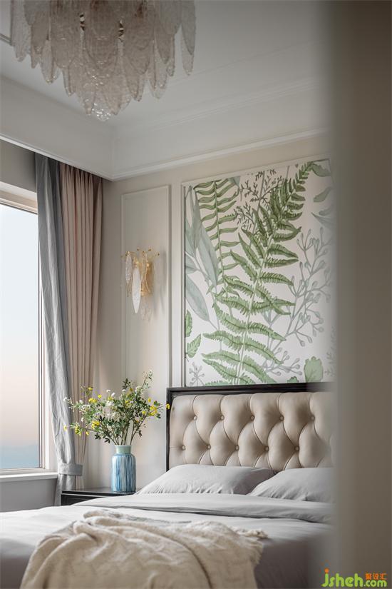 主卧在延续客厅浅色系基调的同时,增添了偏暖一点的奶咖色作为墙面颜色,更显温馨柔和。大胆使用了华丽辉煌、设计感十足的吊灯,让人眼前一亮,视觉效果极佳。家装设计背景墙也不再保守,选择了大面积的绿植花样,时尚感顿生。