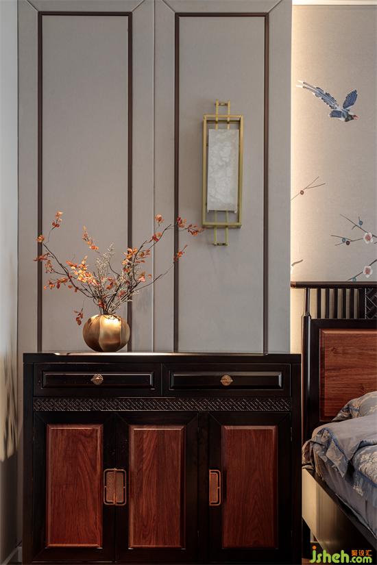 The background wall uses natural flower and bird paintings as bedside decoration, highlighting the "ink" elements in traditional Chinese painting, elegant and pure, giving people a warm and calm feeling. The design of the bedside table is antique, and the golden lighting embellishes a trace of imperceptible luxury. The taste of the style is obvious.