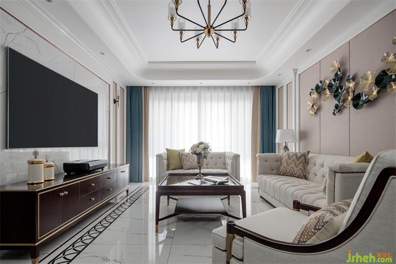 色彩以浅色调为主,沙发墙辅以亚灰色背景,凸显空间层次感。家装设计黑色实木电视柜造型精巧,丝毫没有沉郁之感。