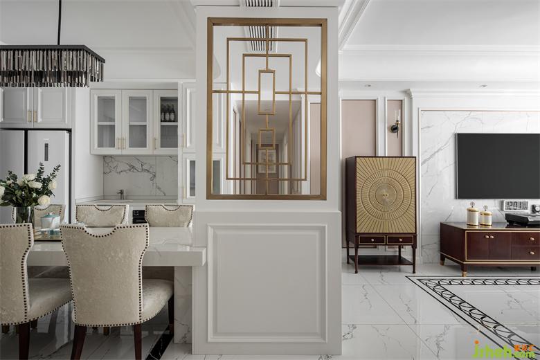 白色系的设计让餐厅更加洁净、明朗,亮点在于餐厅与客厅间的隔断,金色边框提升了空间亮度,家装设计丰富了色彩氛围,整体效果更加自然和谐。