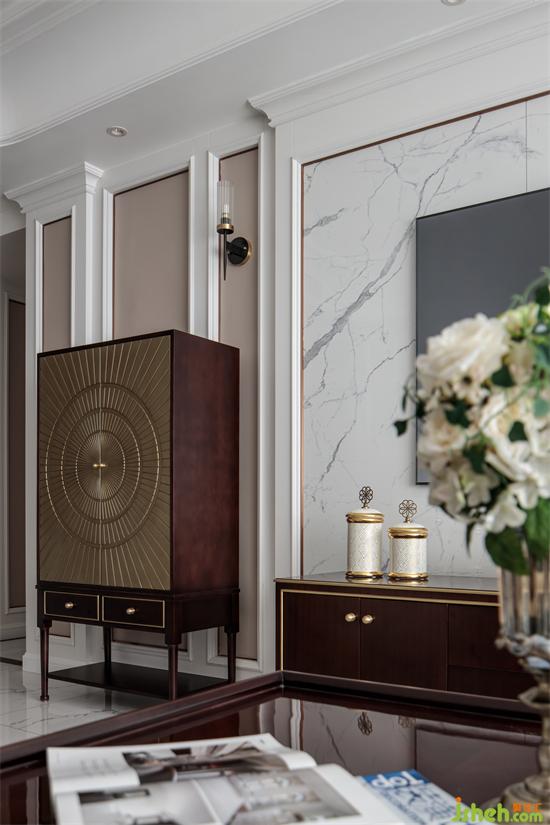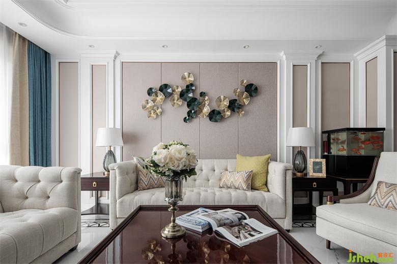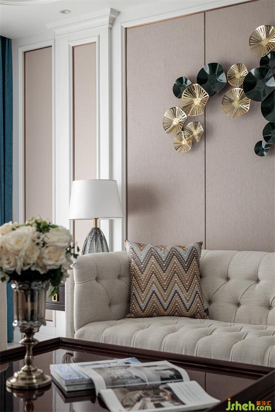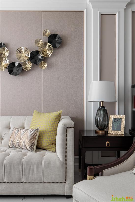 金色边的点缀和背景墙的装饰相映成趣,增添了几分复古情怀,提升了整个空间的格调。家装设计沙发分位摆放,布局紧凑合理,实用性更强。