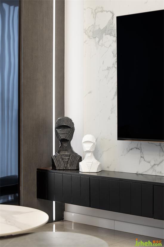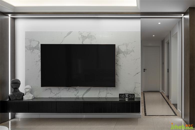 黑色定制电视柜极具质感,悬空设计增加了视觉空间和使用空间,家装设计整体效果干净、简洁、通透。