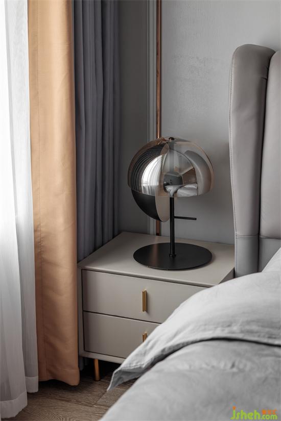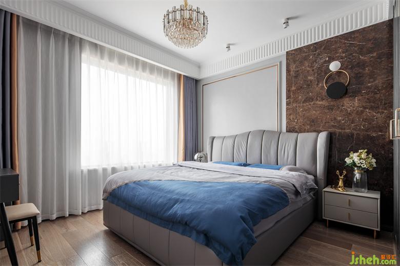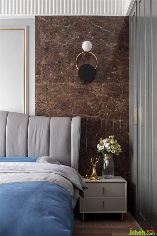 主卧设计的亮点在背景墙,一半是亮面,一半是软包,家装设计像对联一样,有着别具一格的对称美。上联是:瓷镜与流光齐飞,下联是:柔情共美梦同来。