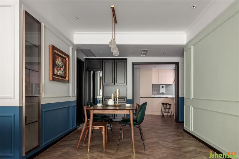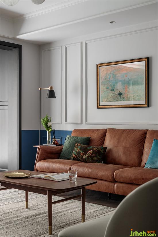 公共空间撞色的撞色处理,上墙刷灰白色,经典百搭;家装设计下墙刷墨蓝色,分色的处理使得整个空间的色彩一下提升起来,多而不乱,增加了层次感和对比度,格调满满。