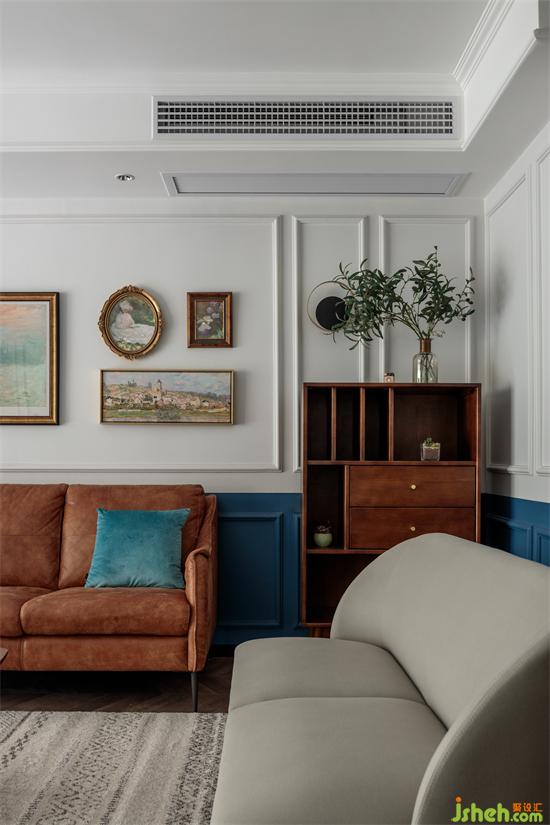 家具的搭配精巧别致,工艺风的沙发和原木的柜体产生碰撞,实木斗柜和茶几烘托出几分厚重感,家装设计精致的灯具与做旧的画框、间错的布局,颜色上大刀阔斧,多种元素同时出现,在质感上得以统一,和谐共生。