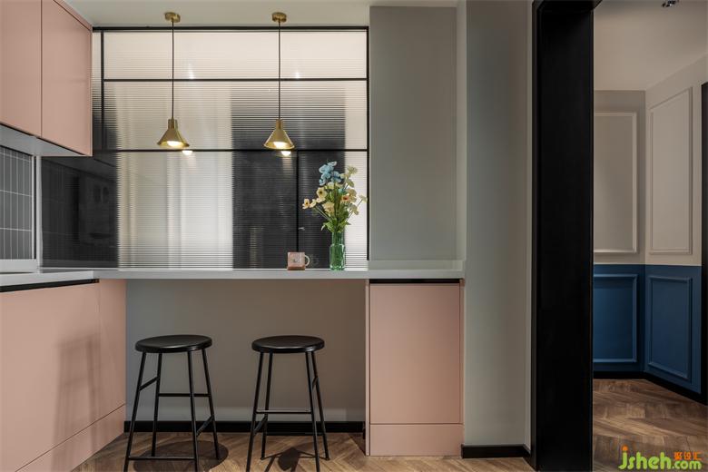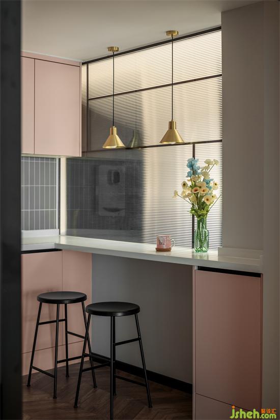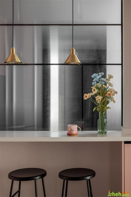 在吧台位置设计了一个玻璃隔断,家装设计区分了区域空间,独特美观,又为空间引入了光。