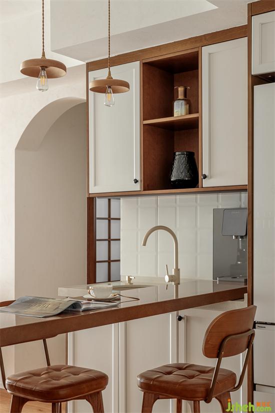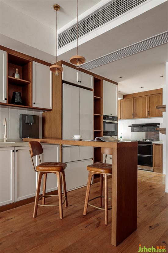 改变户型原本厨餐分隔的传统样式,根据屋主的生活习惯,用全开放式厨房设计,家装设计搭配靠墙吧台,极大增强了空间的实用效果和视觉效果。