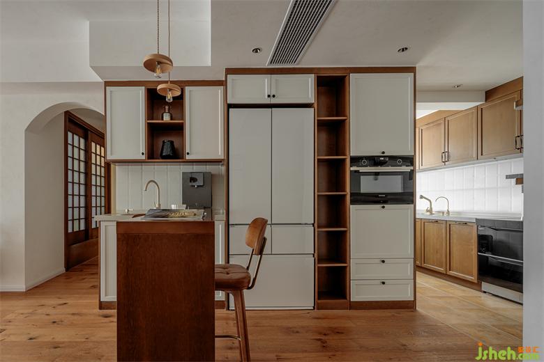 Change the traditional style of the original kitchen and meal separation of the house type. According to the living habits of the owner, use the full open kitchen design with the wall bar, which greatly enhances the practical effect and visual effect of the space.