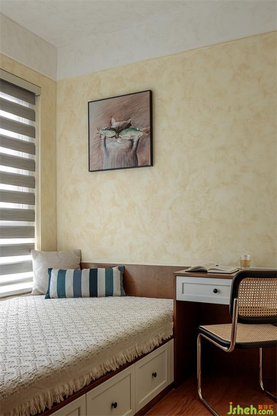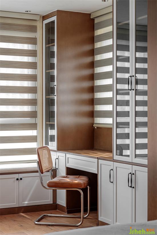 At the same time, low lockers and bookcases are customized at the balcony, which further enhances the functionality of the bedroom. Reading, writing, working and playing computer can be realized in the bedroom. The spacious cloakroom also provides a play space for mumu (pets).