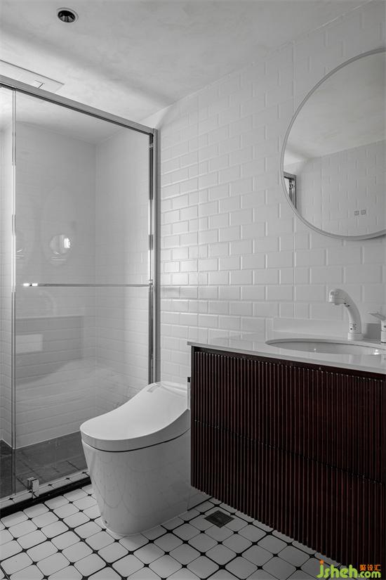 家装设计用浴室隔断分出了干湿两区域,整体简洁实用,干净明亮。