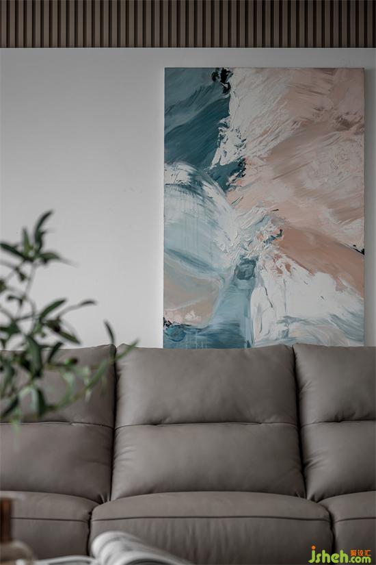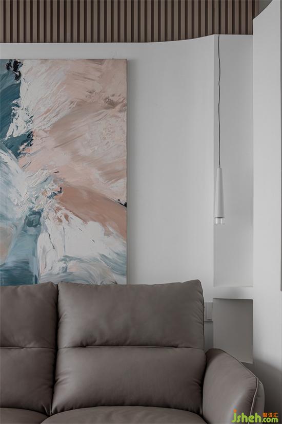 统一的色调把控,从墙面到柜体,大面积使用纯白色,营造出敞亮通透、干净简洁的空间感。同时,间错插入木色线条,家装设计通铺木地板,意识流的挂画装饰对沙发背景墙进行了恰如其分的点缀,丰富了视觉效果,空间层次感得以体现。