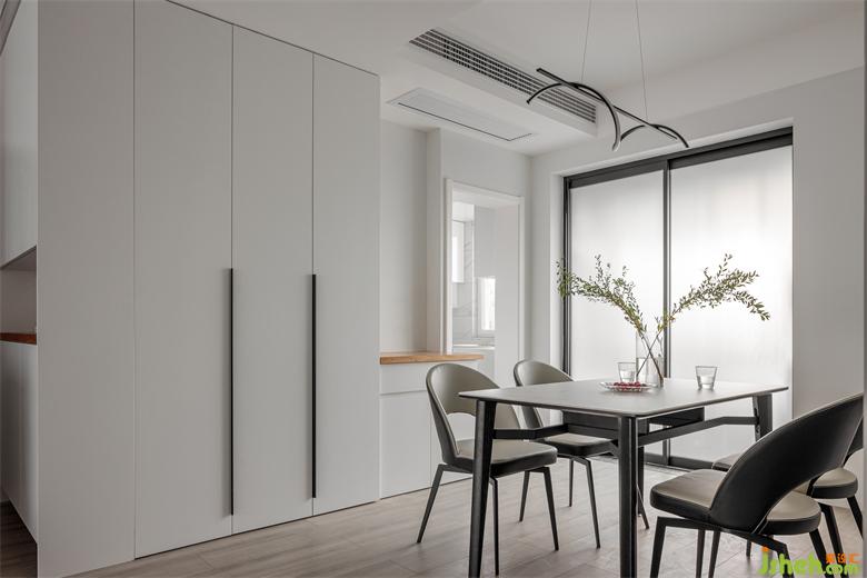 强大的储物功能打造,家装设计把入户空间进行了充分利用,改造成了一个小型储物间,婴儿车、自行车和旅行一应物品都可以放置在这里。餐桌椅的选择也是极简的黑白搭配,与空间风格相融合。