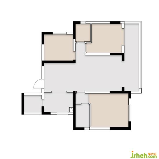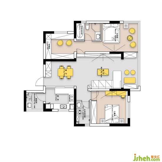 ②原有阳台空间大,考虑到业主的生活习惯,将其一分为二,一部分依托于客厅,作为休闲的茶室,一部分用于扩充主卧的空间。