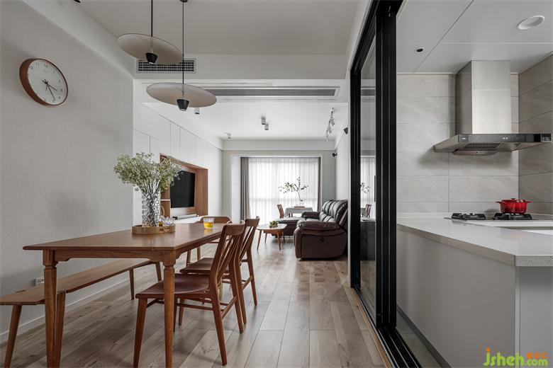 ①家装设计打破厨房原有格局,利用移门打造多功能实用空间,实现了厨餐厅的联动。