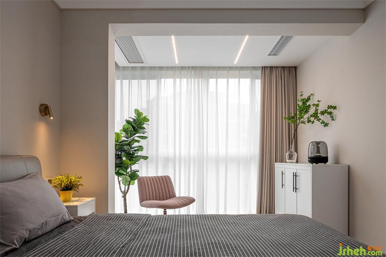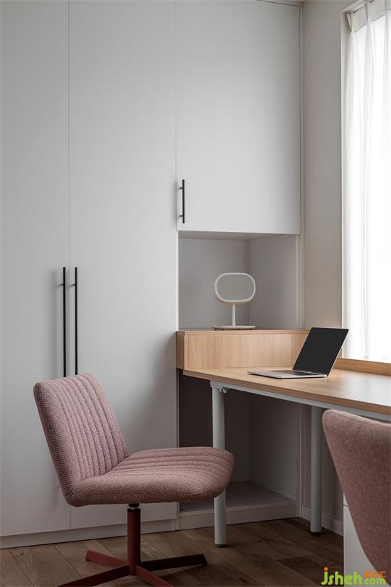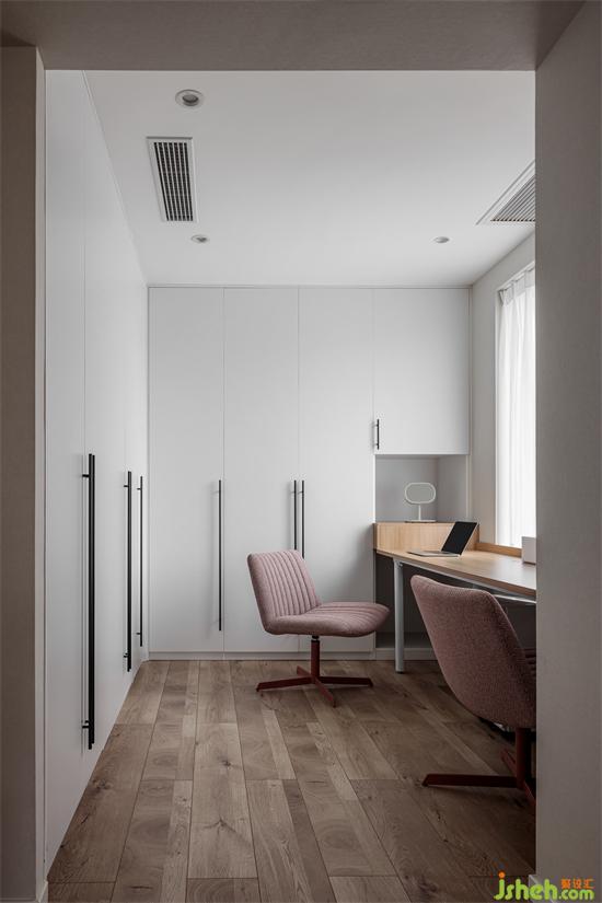 在主卧衣帽间的一角,设计了一张长书桌,可满足两人同时使用,把每一寸空间利用到极致,家装设计增加了区域的功能性。