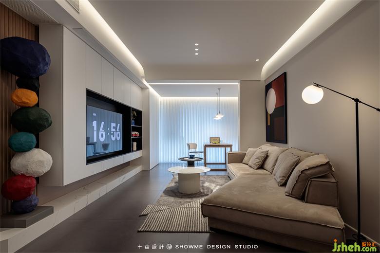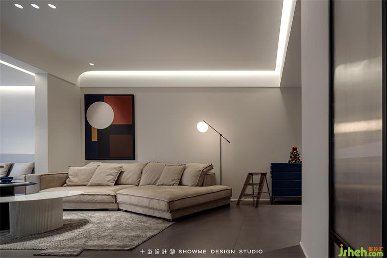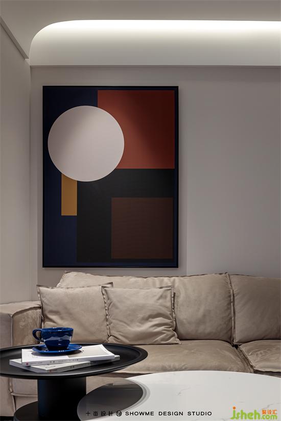 客厅的家具搭配打破传统规则的L型沙发+方形茶几,改为翅膀型沙发+圆形错位茶几的组合,灵活性和实用性都大大增强。