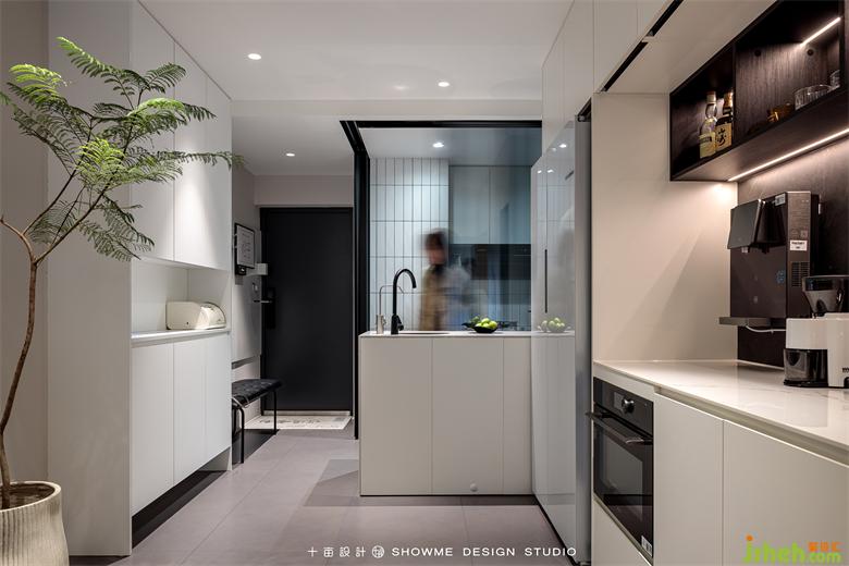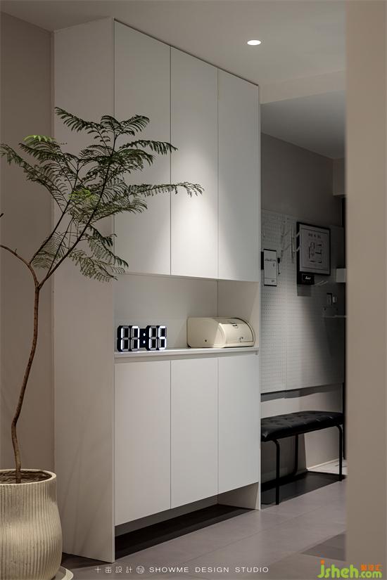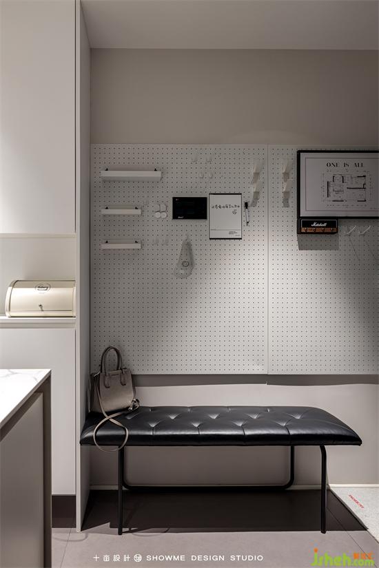 进门的纵深感很强,首先看到的是客厅的大窗户,窗外的框景与室内构成完整和谐的视觉效果。右手边是实用性很强的鞋柜、凳子、小件挂架,满足回家放置物品的第一需求。