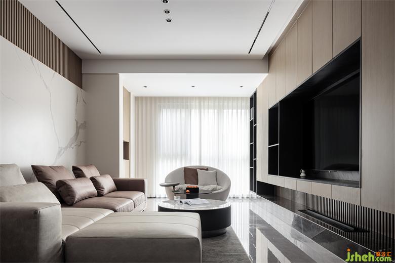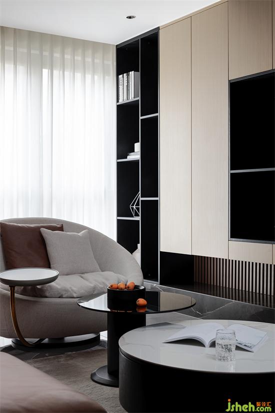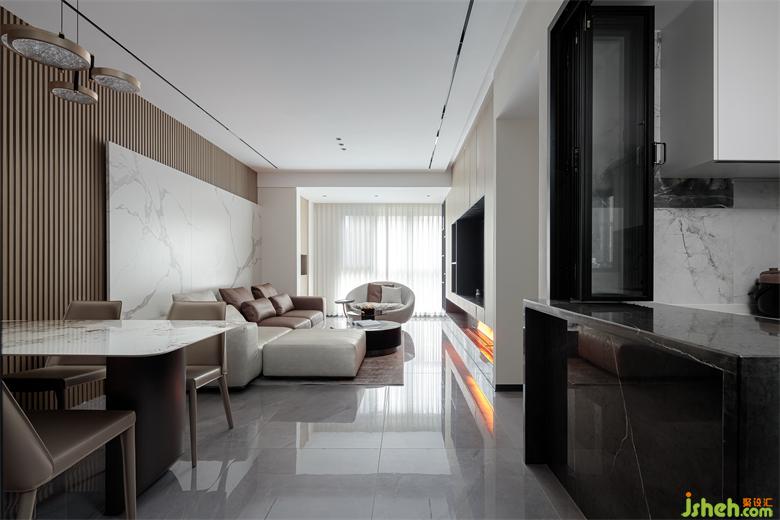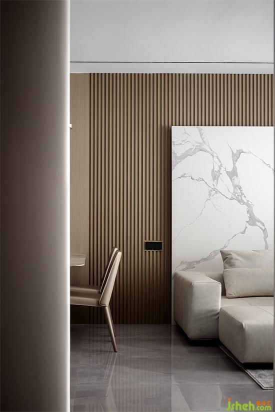 沙发背景墙采用木格栏与白色岩板相间搭配,凸显出现代主义的时尚感,同时也与沙发的色彩搭配形成完美的呼应。