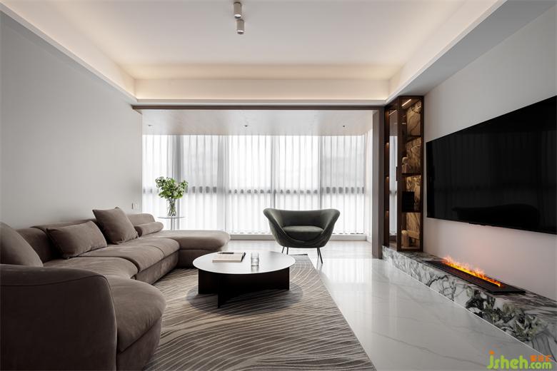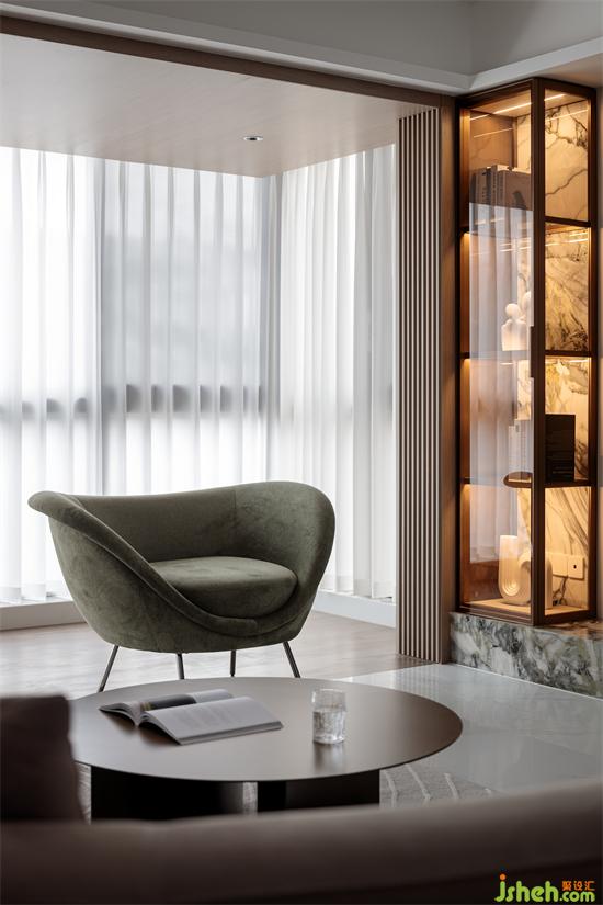 灯光的设计也是重要的一环,采用线性光源向上打光,国宾上院家装设计在视觉上抬高客厅的层高,增加空间明亮度。