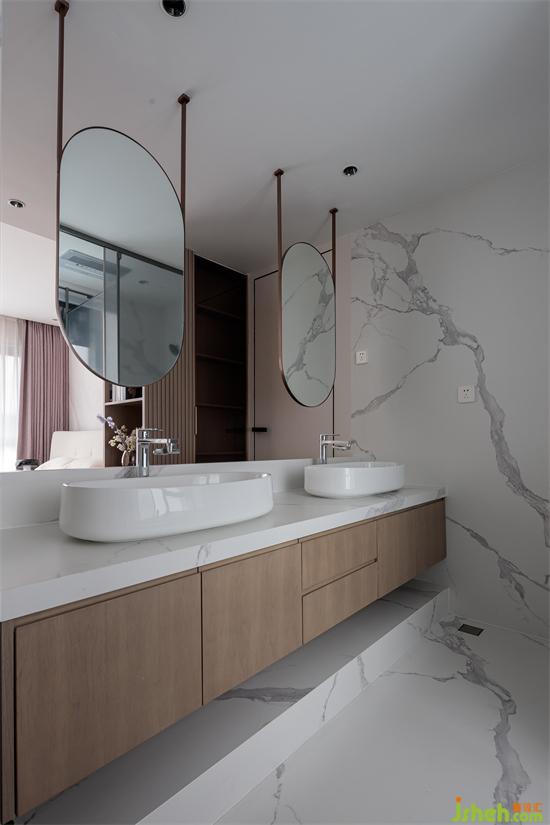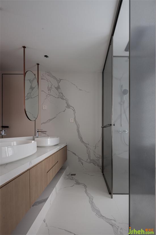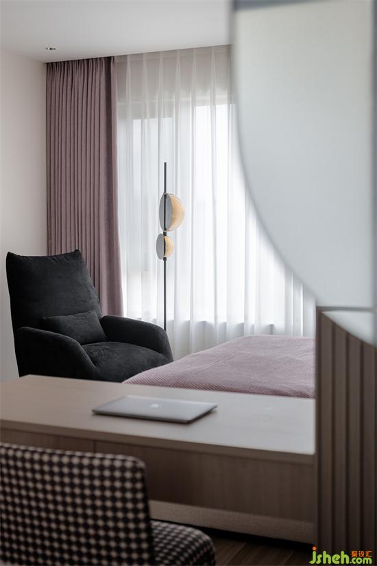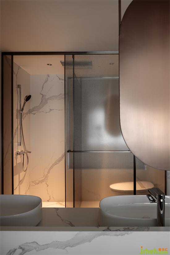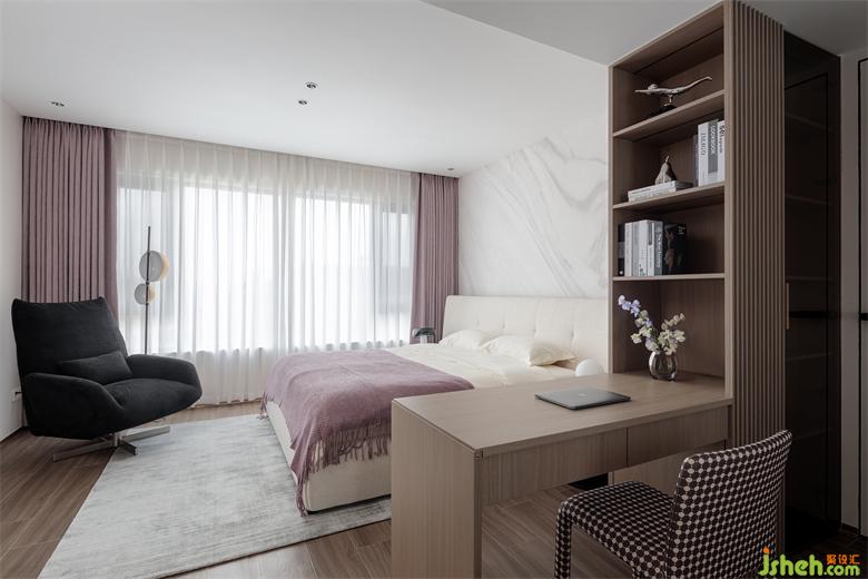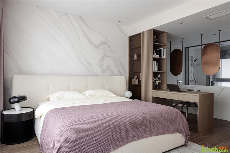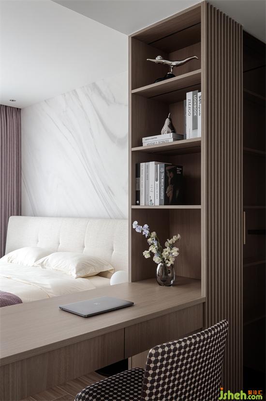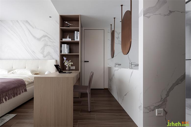 一如既往采用了咖啡色与白色的搭配,营造低调而静谧的入眠空间。国宾上院家装设计将卫生间、书桌、睡眠区域打通连接处理,并通过轻隔断让空间既通透明亮、又富有层次感,同时营造出慵懒时尚的居家氛围。