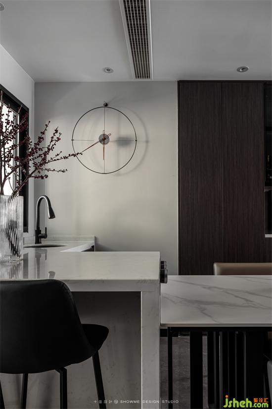 通过结构调整,将厨房区域移动至生活阳台,金科王府家装设计在原有位置打造出吧台+餐厅的用餐区,释放空间,观感上更显开阔。