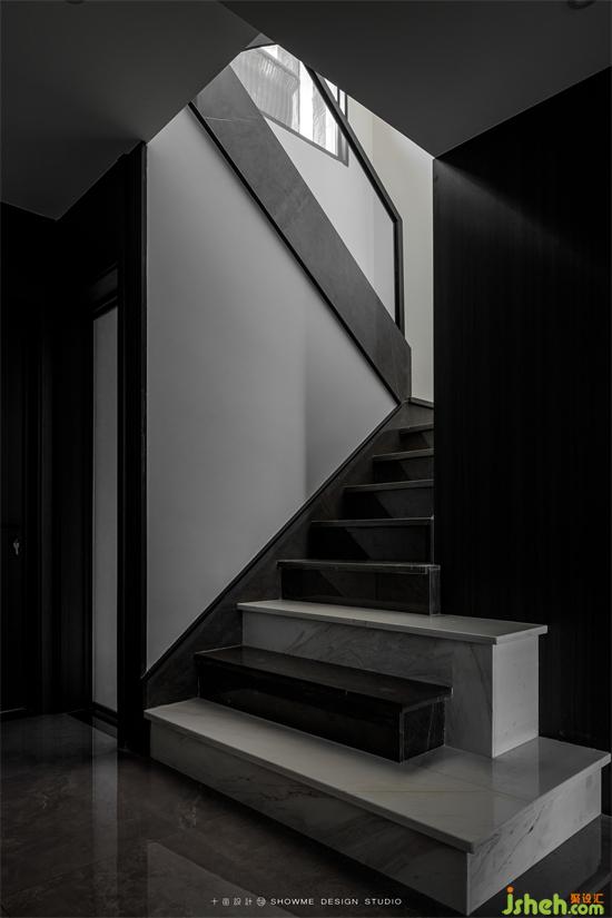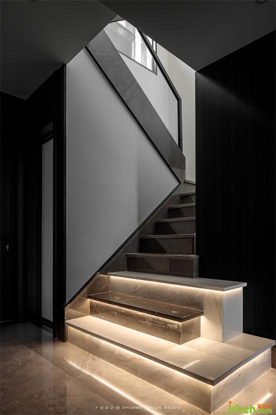 楼梯特色在于每一层台阶都采用了感应灯带设计,金科王府家装设计随着步伐的节奏,灯带自动亮起,更有此时无声胜有声的音乐律动感。