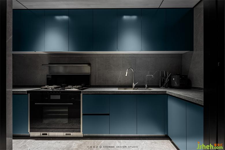 橱柜木饰面板与卧室木饰面板色彩一致,仿佛来自深海的颜色,充满了神秘和无限可能。内江邦泰天著家装设计清洗区、切菜区、烹饪区布局合理,为日后的厨房生活设计出便捷高效的流动性路线。