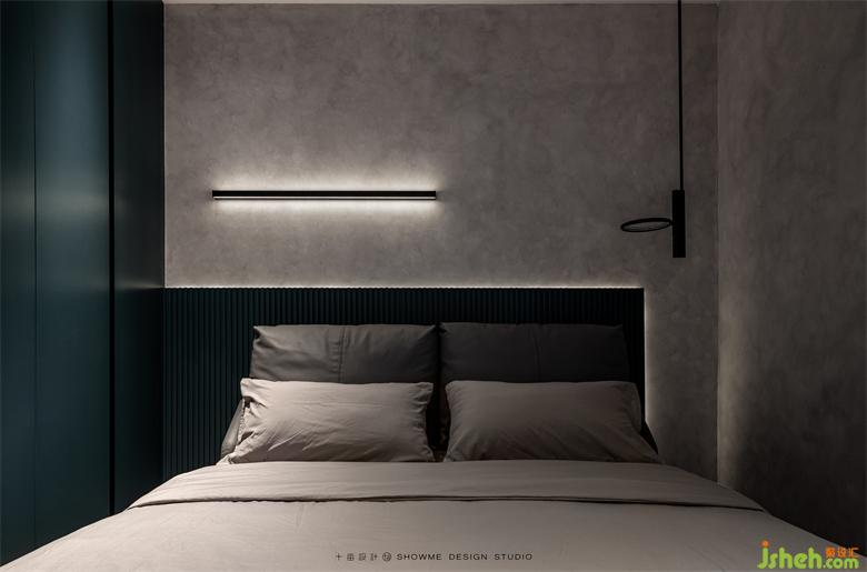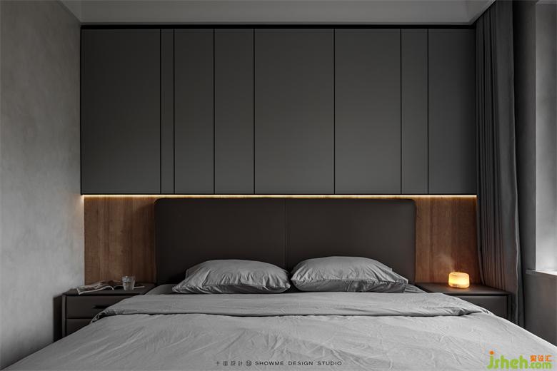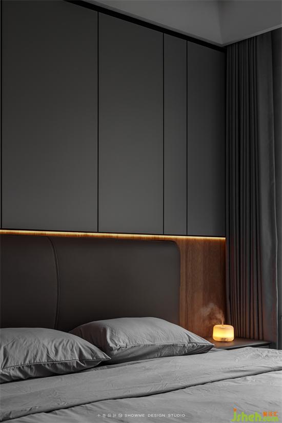 卧室也保持了一以贯之的黑白灰风格。木色背景板和简洁流畅的线条设计是卧室的主基调,内江邦泰天著家装设计没有繁复的卧室吊灯,利用充满设计感的灯带带来的柔光来营造温馨舒适的氛围。
