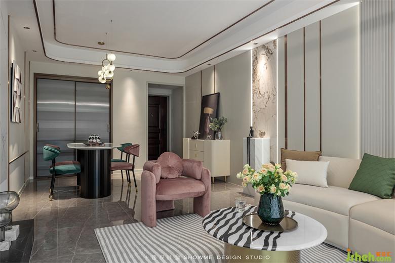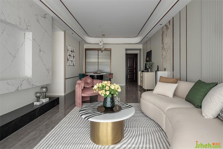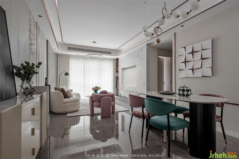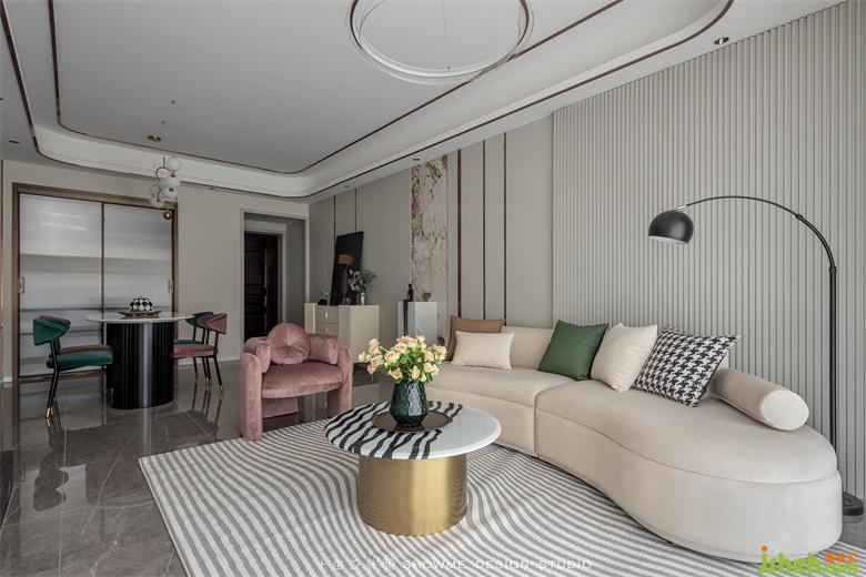 圆弧形吊顶柔美平和,主灯造型简洁大方,颐和上院家装设计让空间感更添几分中庸气息。