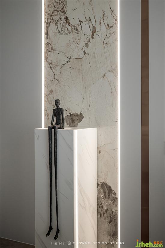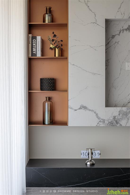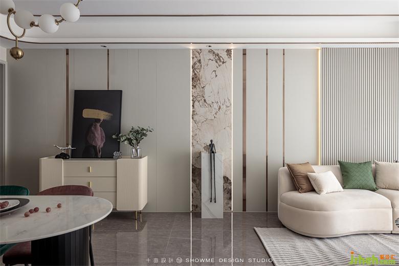 电视背景墙才用了当下最流行的白色岩板材质,与黑色的地台形成色彩上的鲜明反差。