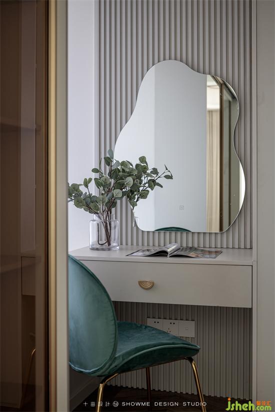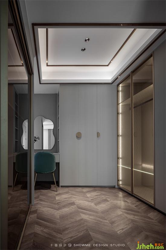 主卧打通了原先的小书房,颐和上院家装设计通过镜面和移门的使用,让整个卧室大了两倍!不仅保留了原有的卫生间,还有宽敞的衣帽间和梳妆台。