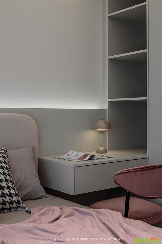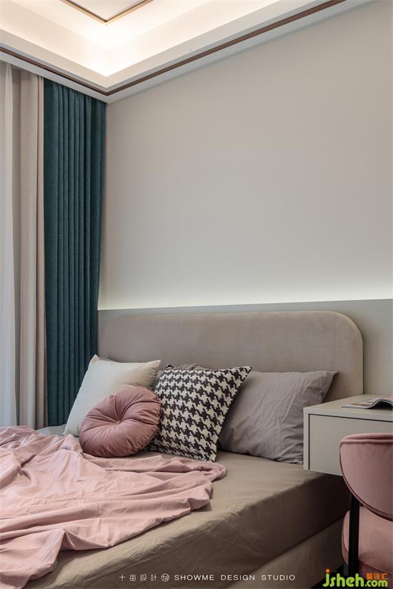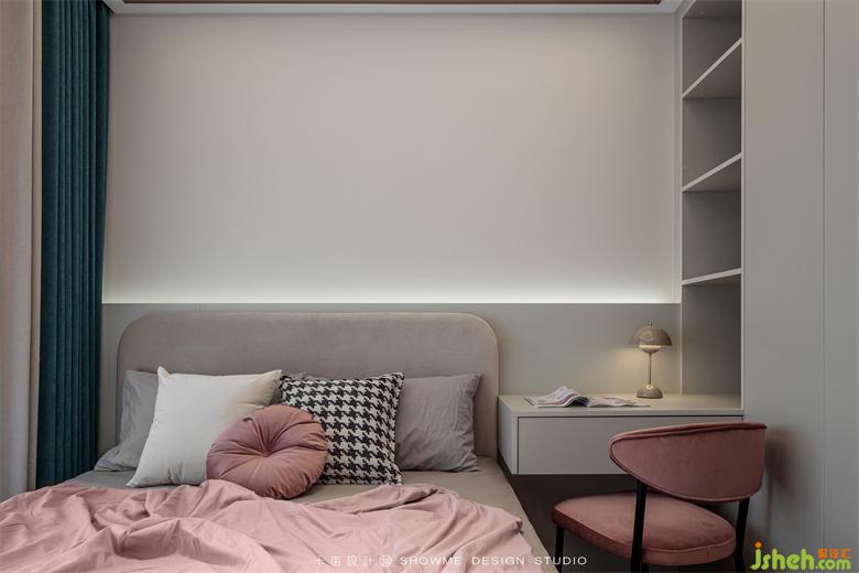 区别于主卧的整体墙面软包,次卧选择半墙软包以达到视觉分层的效果。定制柜上墙的优点明显,既节省了空间,又可以做到一柜多用。